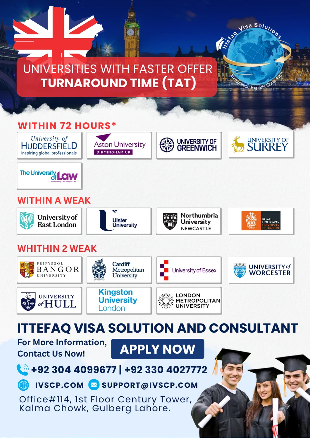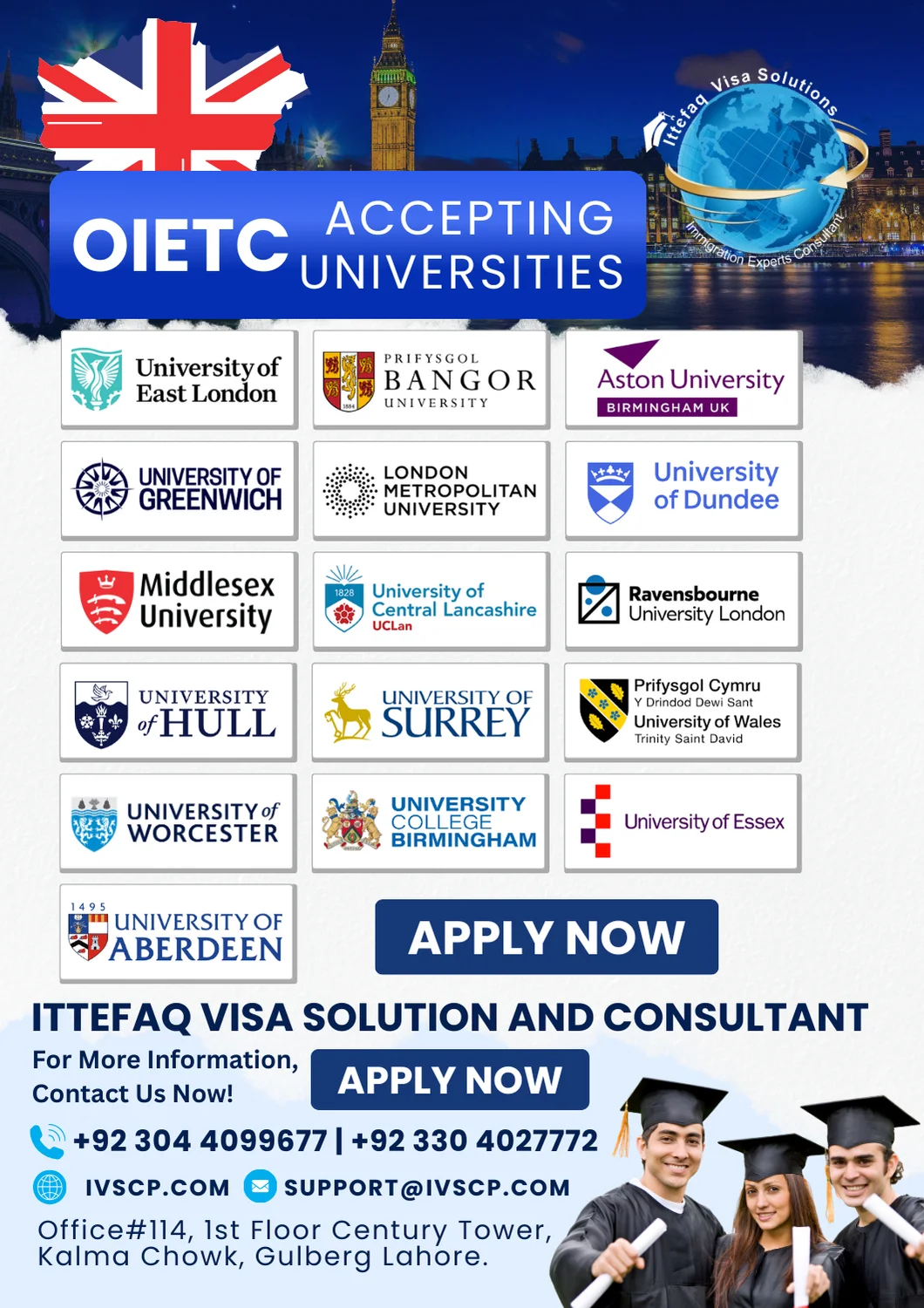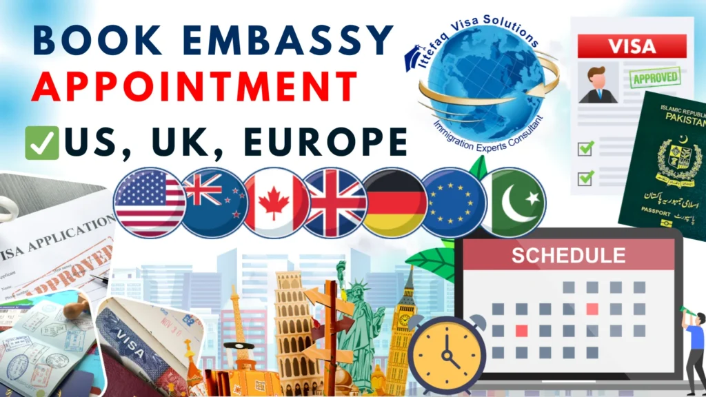 Book your Embassy Appointment in Islamabad, Lahore, and Karachi for visa applications to the USA, Canada, UK, Europe, and more. Ittefaq Visa Solution and Consultant is a trusted and registered visa consultancy in Pakistan, offering expert services for visa appointments, study abroad opportunities, and immigration assistance to countries like the UK, Canada, Europe, and other destinations.